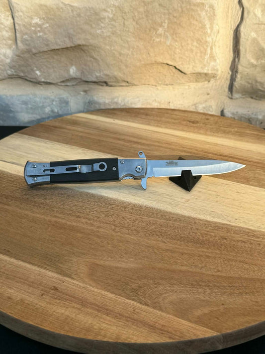ElitEdge 10A96SL Assist Open Stiletto Stonewash Linerlock Knife Black Handles